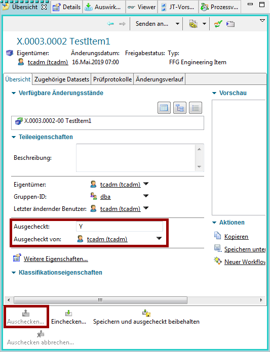 Wenn der Workflow durchgelaufen ist, sind die Revision und alle darunter referenzierten Objekte freigegeben und die Neutralformate wurden erstellt. Beachten Sie, dass diese Revision jetzt eine „Change-Nummer“ erhalten hat.