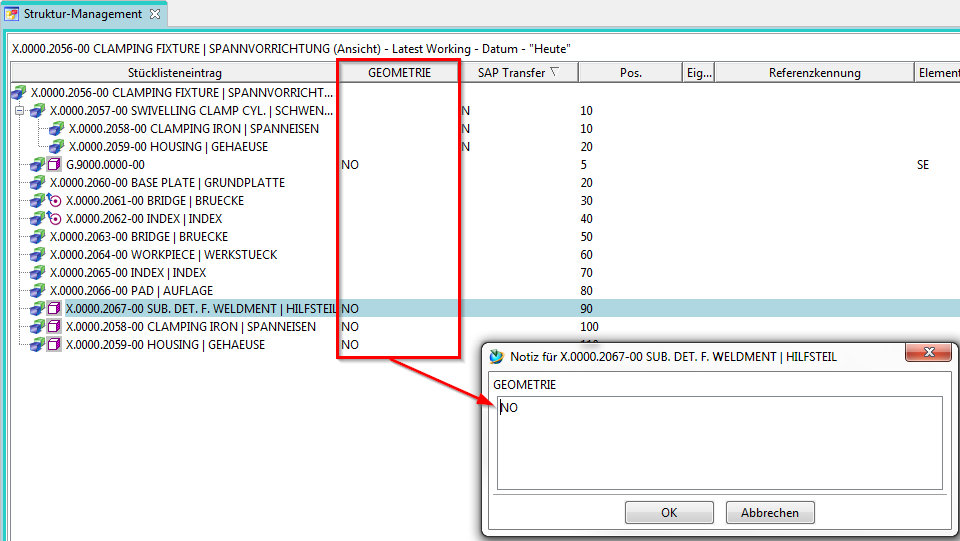 ![]() | Der Struktur-Navigationsbaum ermöglicht die Navigation in der Produktstruktur sowie die Erweiterung oder Reduzierung der Knoten zur Anzeige entsprechender Daten. Die Symbole in der Baumstruktur geben den Zweck jedes Knoten an. Die Eigenschaftsspalten rechts neben der Kennung können an Ihre Bedürfnisse angepasst werden. |
