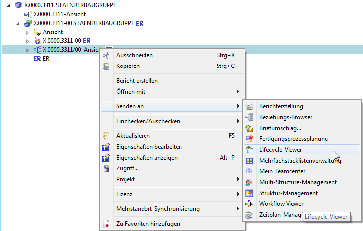 Sie können die Revisionen sowohl im „Teamcenter Navigator“ als auch im „Struktur Manager“ auswählen. Wir werden in diesem Beispiel die Auswahl im „Struktur Manager“ vornehmen.